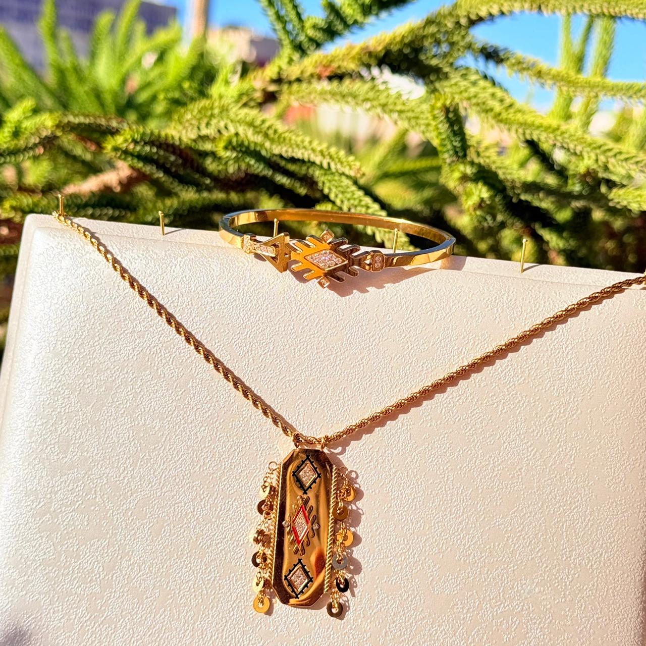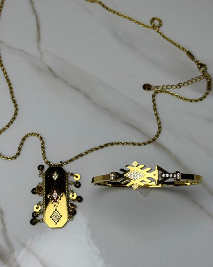 Le collier Izza apporte une touche de raffinement à chaque célébration. son éclat doré sublime la tenue avec grâce et discrétion. Un bijou chic et intemporel, idéal pour illuminer les moments partagés en famille